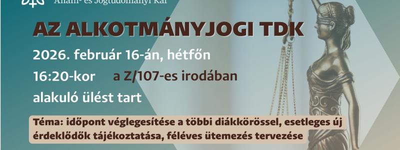 Az Alkotmányjogi TDK 2026 február 16-án, hétfőn 16.20-kor a Z/107-es irodában alakuló ülést tart.