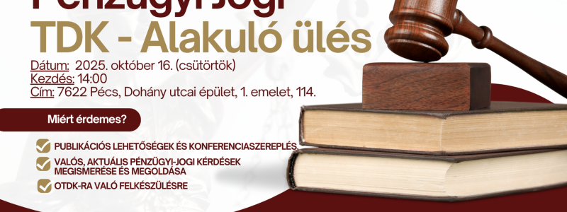 A Pénzügyi Jogi és Gazdasági Jogi Tanszék ezúton tisztelettel meghívja Önöket a Pénzügyi Jogi Tudományos Diákkör (TDK) alakuló ülésére.