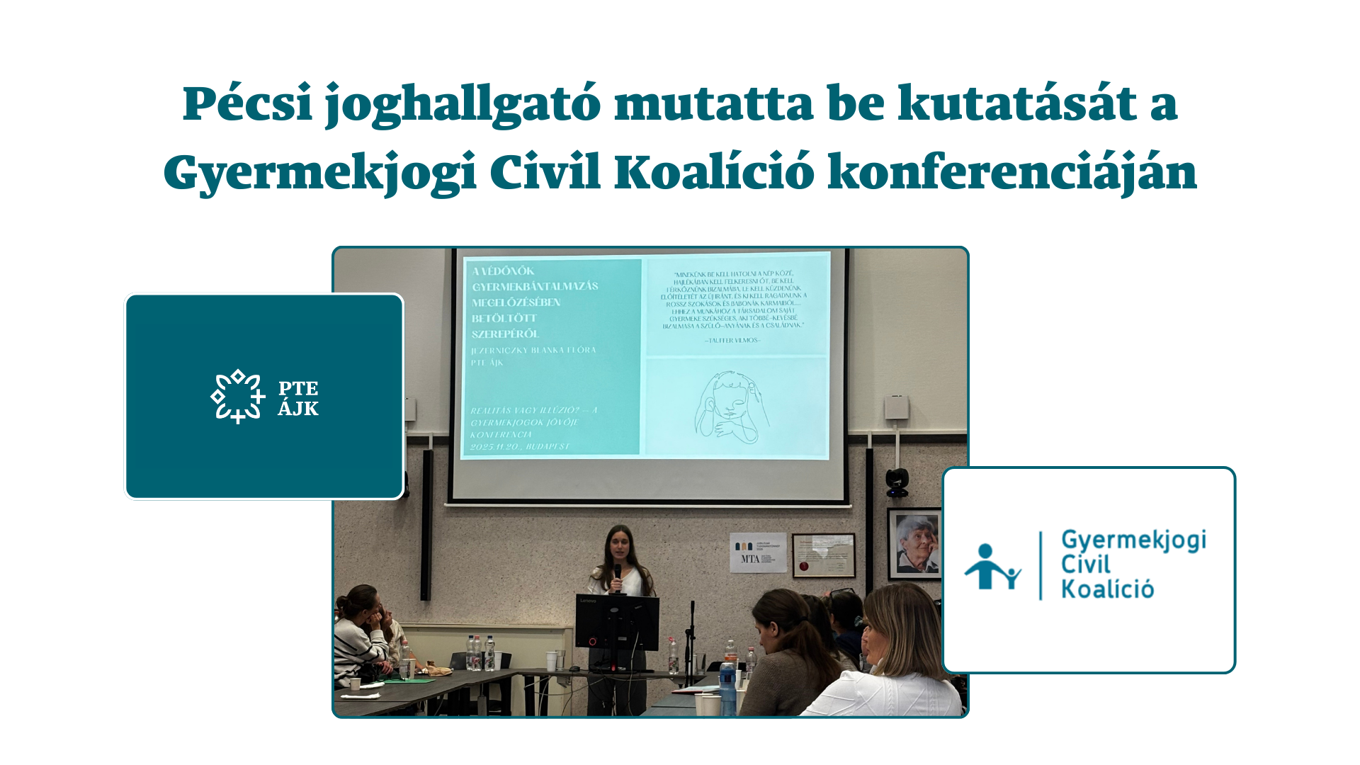 Jezernicky Blanka Flóra, a PTE Állam- és Jogtudományi Kar negyedèves hallgatója, a Gyermekjogi Civil Koalíció és az ELTE TÁTK közös szervezésű "Realitás vagy illúzió" a gyermekjogok jövője elnevezésű konferencián gyakorló szakemberek mellett adta elő saját kutatását "A védőnők gyermekbántalmazás megelőzésében betöltött szerepéről" címmel.